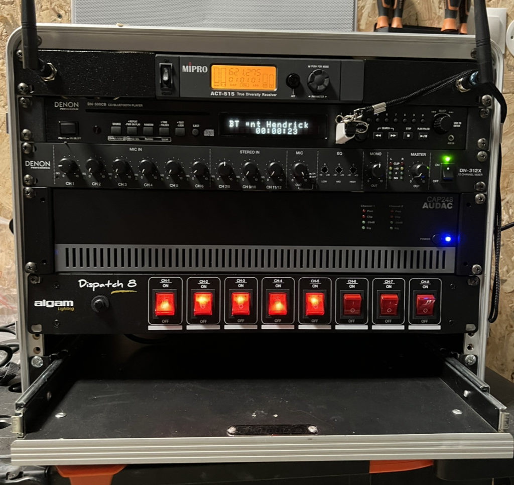 -Un micro HF sans fil -Des haut-parleurs -Deux ampli -Un mélangeur 12 canaux -Un lecteur CD, Clé USB et Bluetooth