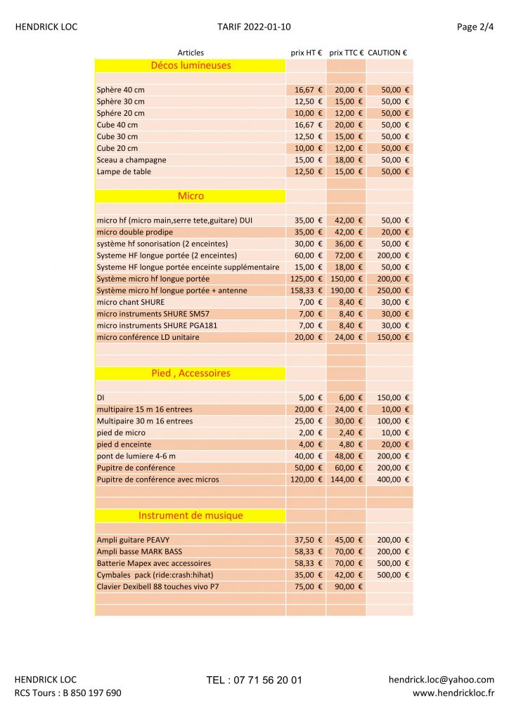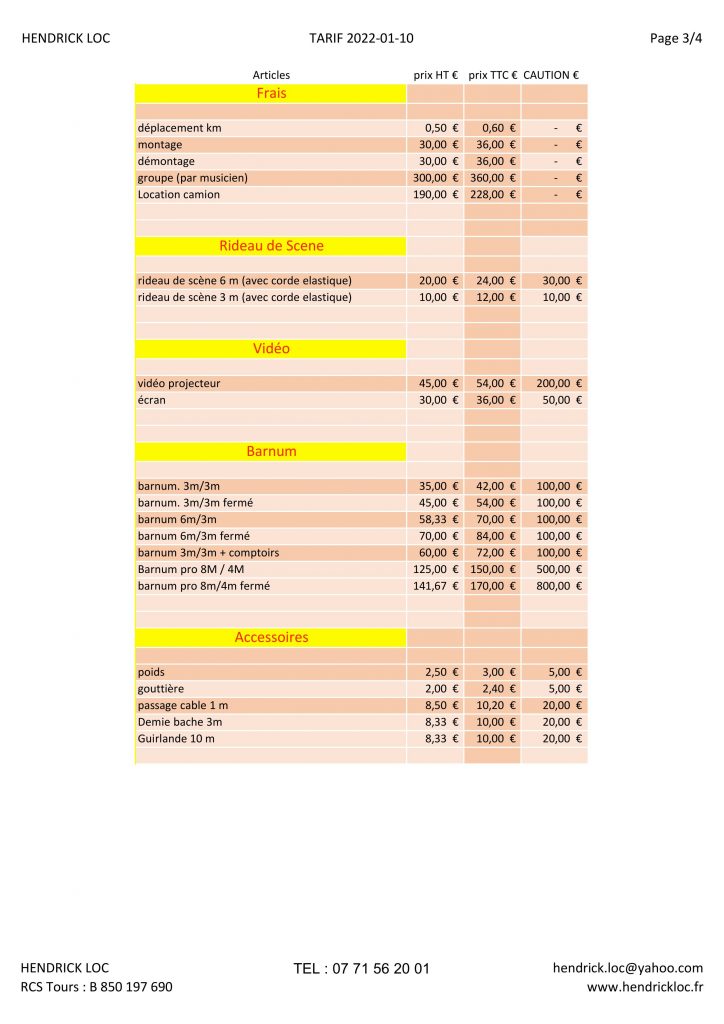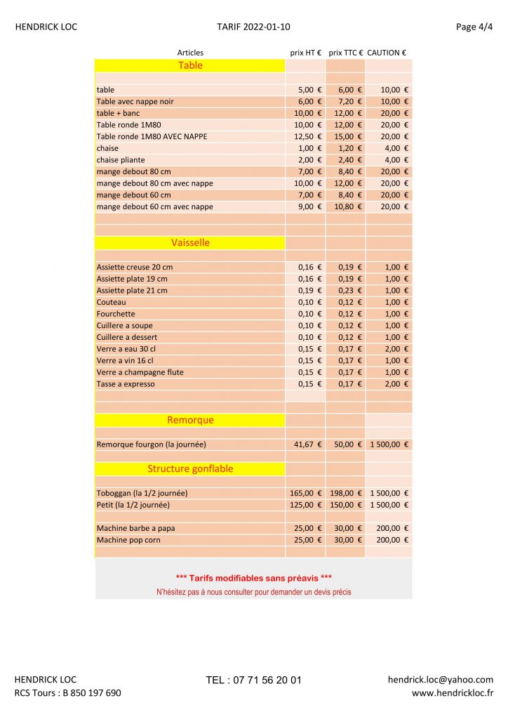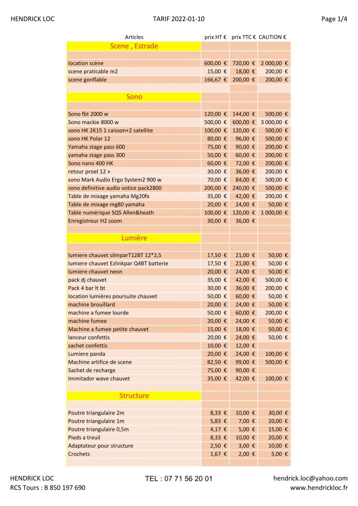 Tarifs Prix à la journée Tarifs à imprimer au format PDFA télécharger (lien ci dessous).Tarifs modifiables sans préavis.N’hésitez pas à nous consulter pour demander un devis.=> Tarifs Hendrick Loc avec Caution <= Tarif TTC pour un week-end du vendredi au lundi, ou 48h en semaine.
